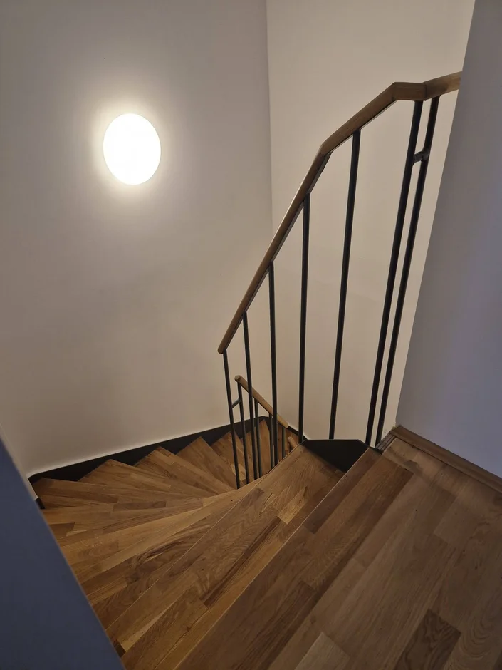The internal staircase was completed with wooden treads and metal railing elements. Precise alignment and secure fixing were essential to ensure safety, comfort, and visual clarity. -