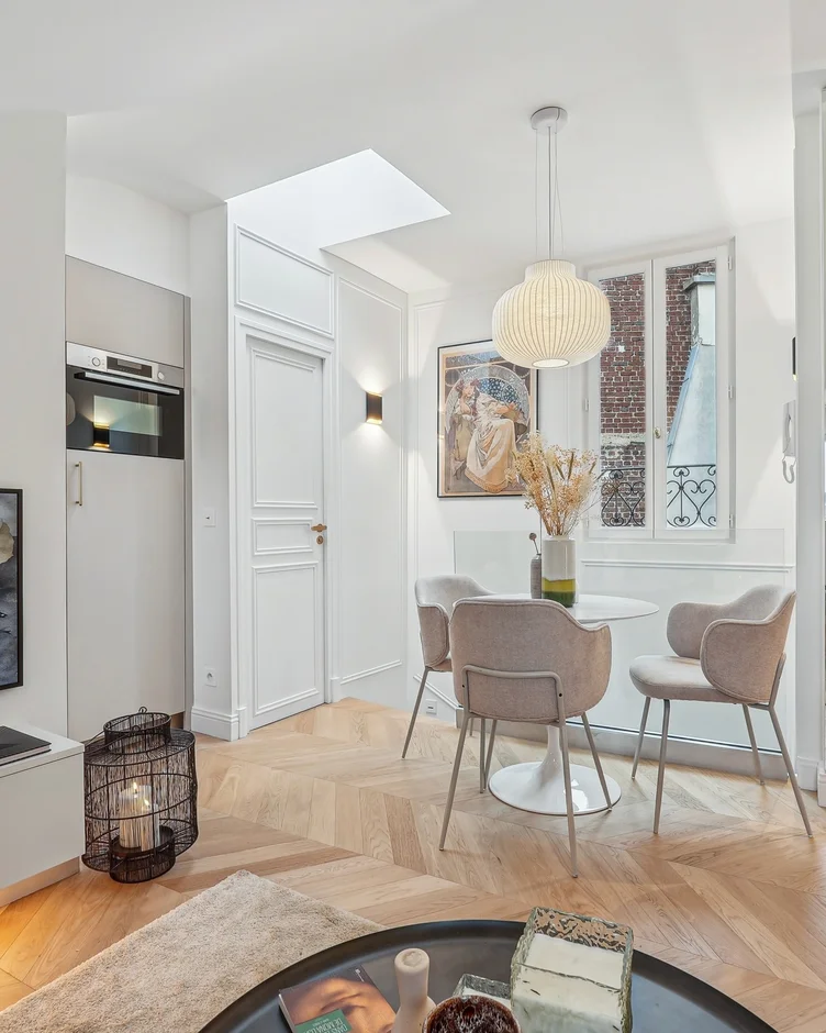 Continuous parquet flooring was installed throughout the apartment, providing a uniform and durable surface. Special attention was given to joints, thresholds, and edge detailing to maintain a seamless appearance. -