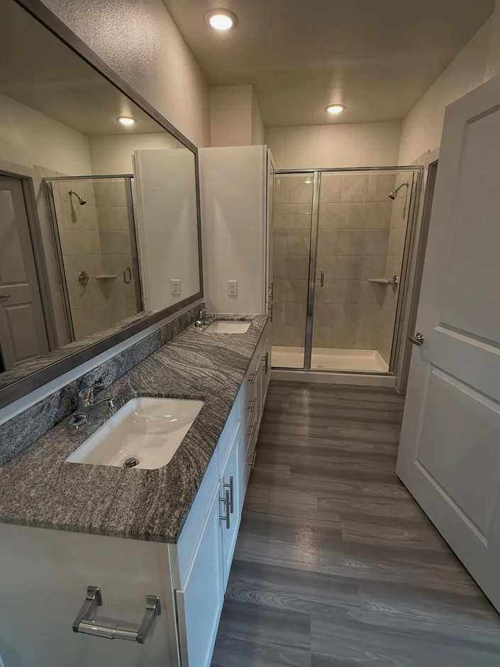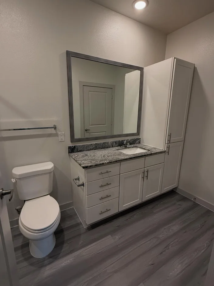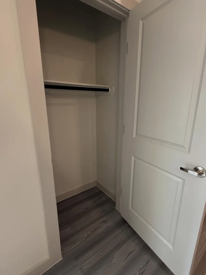 The living areas were completed with resilient plank flooring, while bedrooms and storage spaces feature carpeted finishes. Transitions between materials were carefully detailed for durability and visual continuity. -
