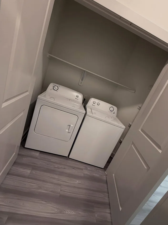 A dedicated laundry area was completed with washer and dryer connections, shelving, and appropriate flooring for utility use. -