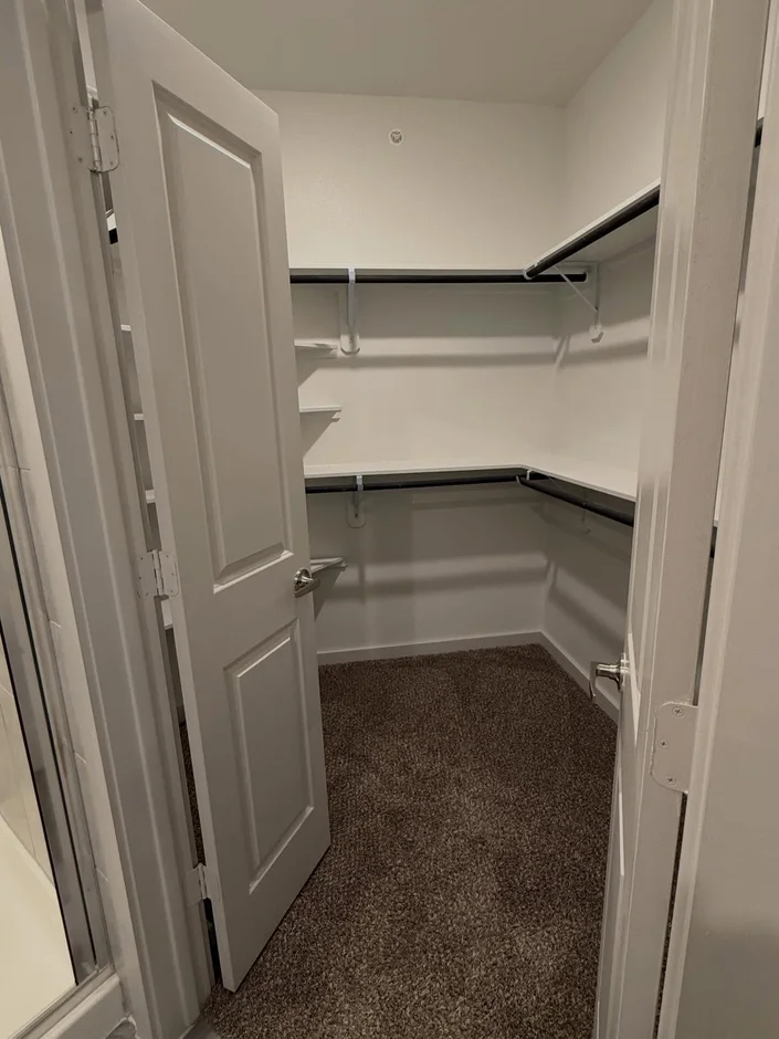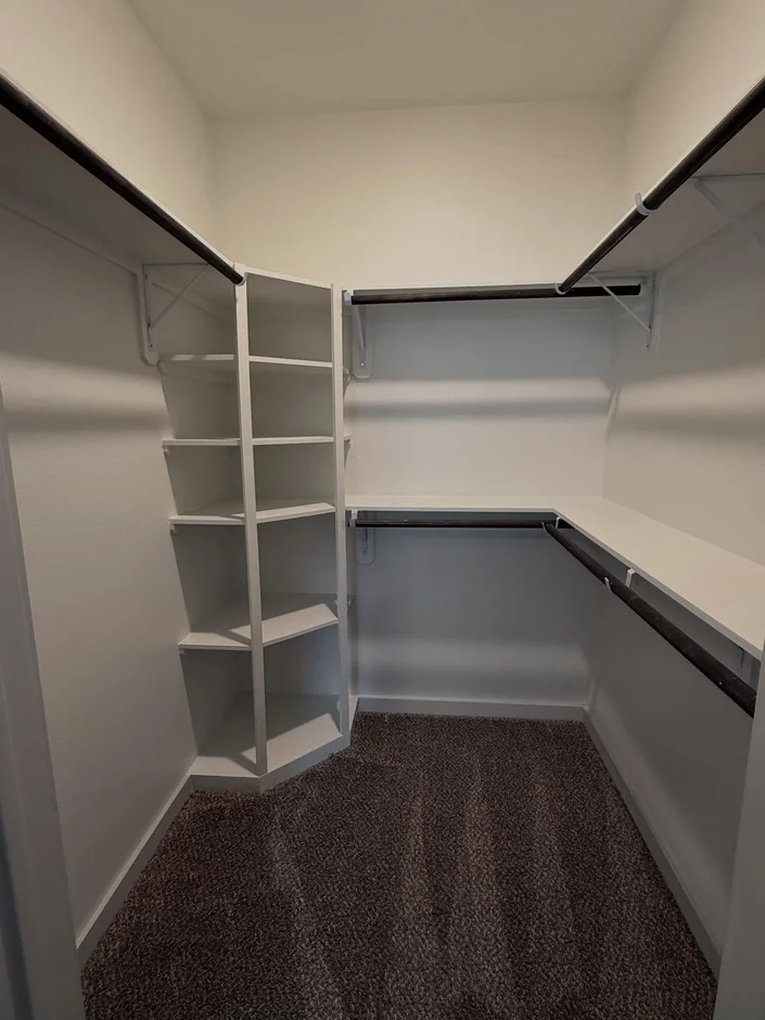 Walk-in and standard closets were completed with shelving systems and hanging rails. Finishes and flooring were coordinated with adjacent spaces for consistency. -
