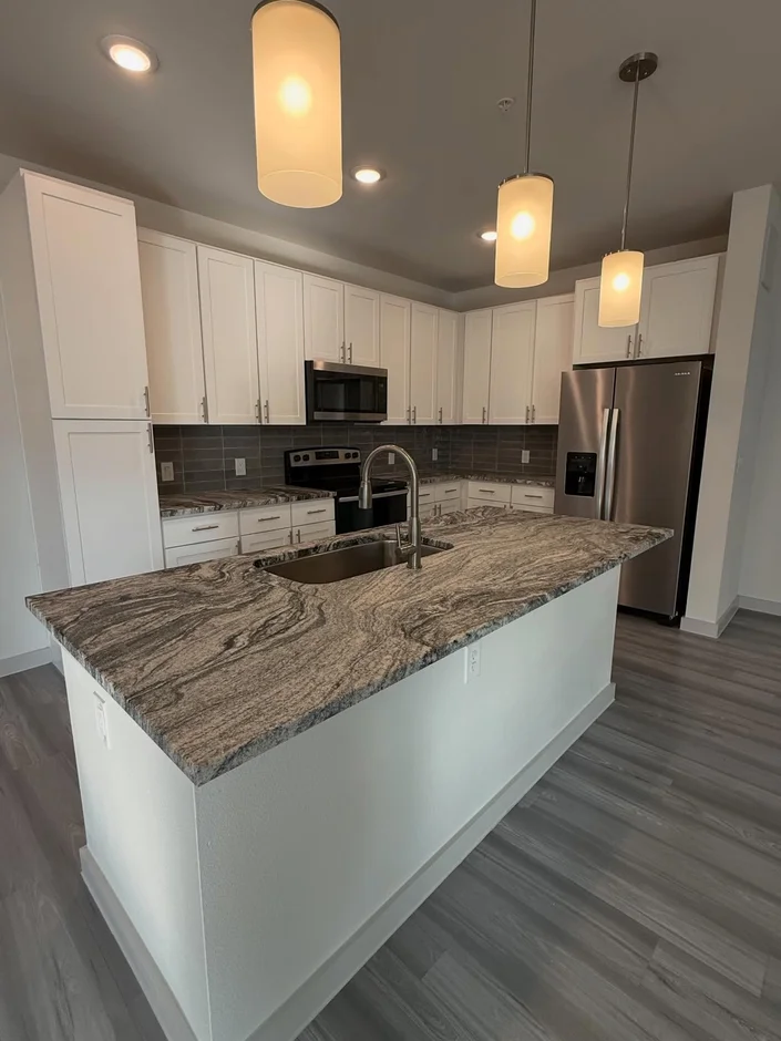 The kitchen was fully installed, including cabinetry, stone countertops, tile backsplash, and integrated appliances. Electrical and plumbing connections were completed in accordance with technical specifications. -