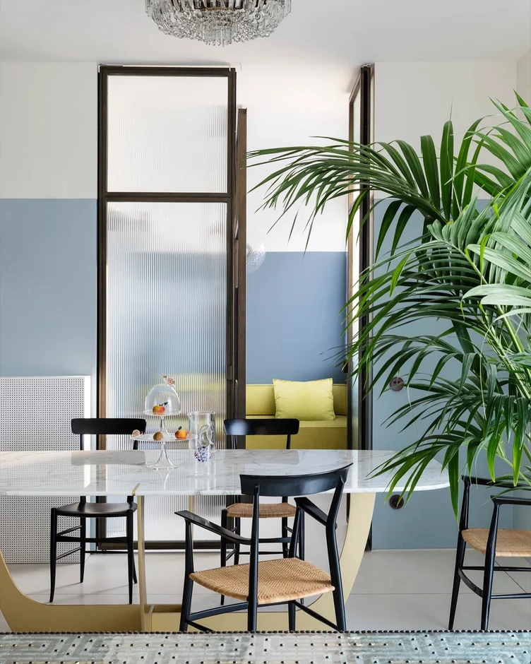 Custom glass doors and partitions with dark metal frames and ribbed glass panels were installed to define zones while preserving transparency and natural light flow. -