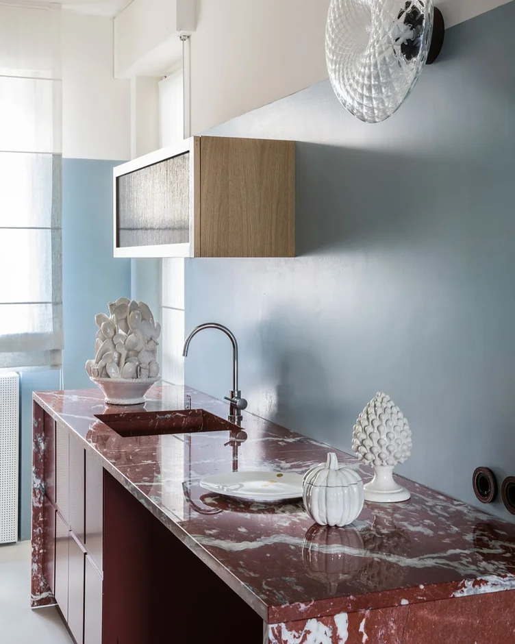 The kitchen was executed with stone-clad worktops and island, integrated cabinetry, and concealed appliances. All plumbing and electrical installations were completed to ensure both functional efficiency and visual consistency. -
