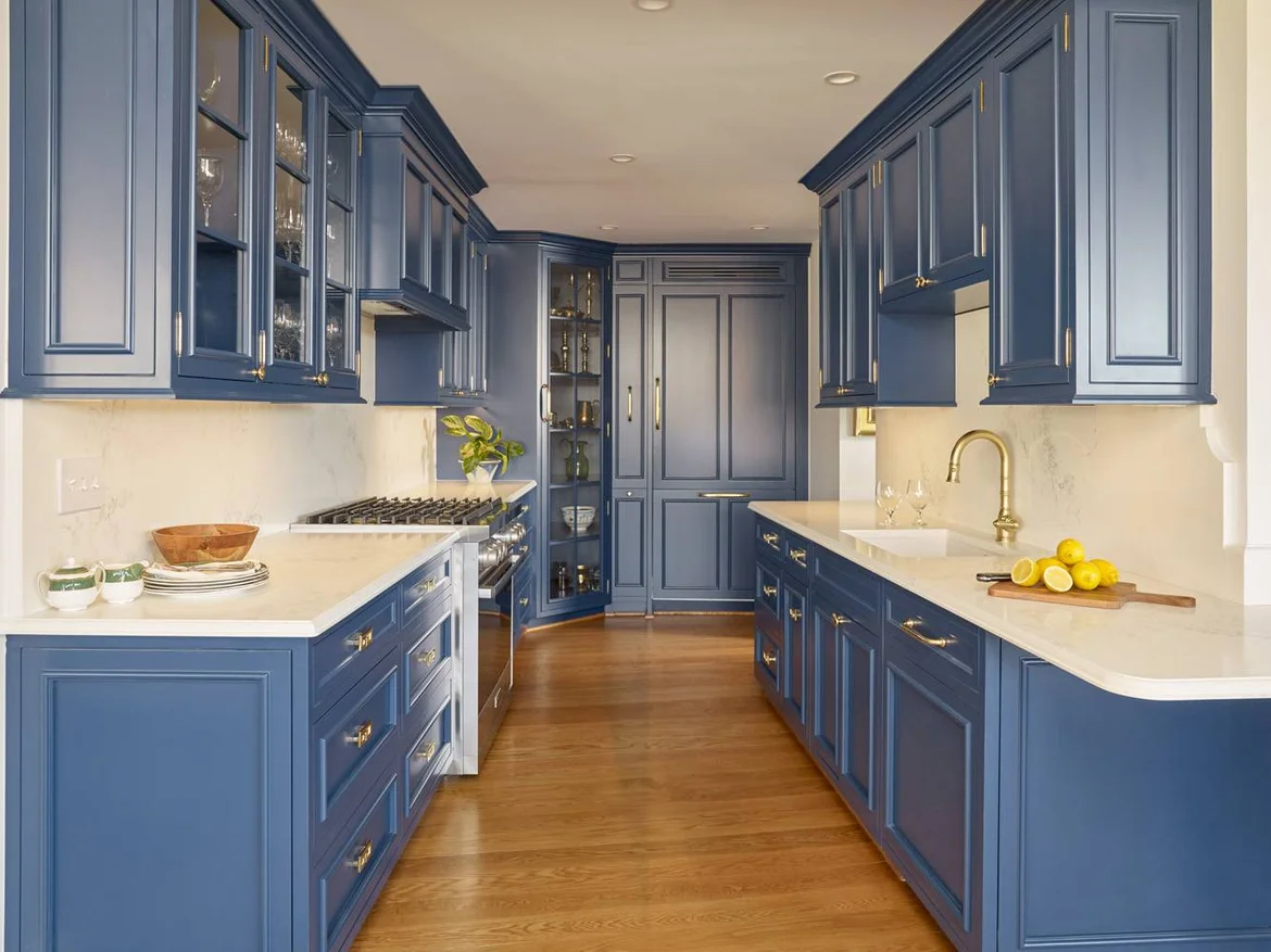 Kitchen transformation: designed a custom blue cabinetry kitchen with integrated storage, quartz countertops, and premium appliances.