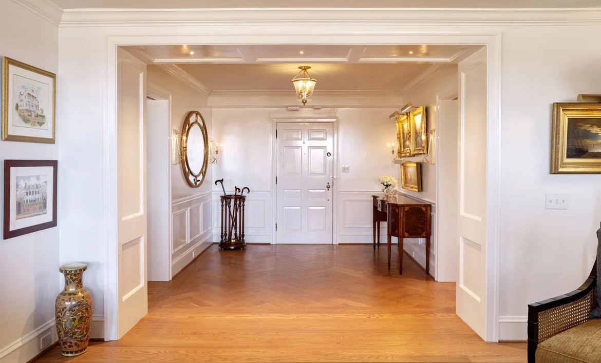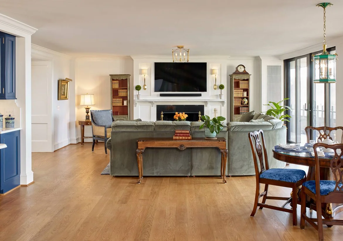 The remodeled condo now reads as one elegant, unified home rather than two joined spaces. The living and dining areas feel expansive yet intimate, framed by classic detailing and warm wood floors. The kitchen stands out with bold blue cabinetry that remains timeless, while the library adds depth and personality. Spa-like bathrooms complete the transformation, delivering comfort, refinement, and everyday luxury.