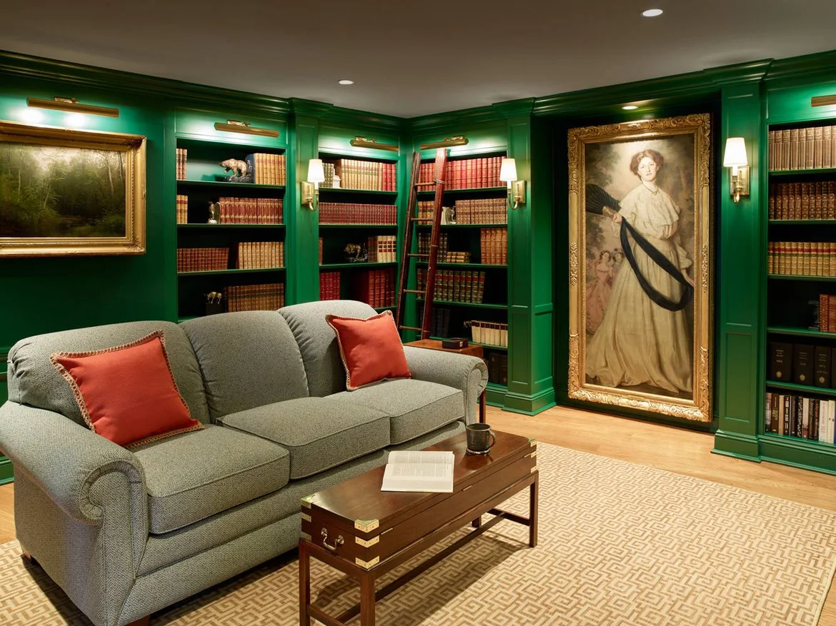 Library / study creation: introduced a rich green built-in bookcase wall to form a cozy, private retreat within the larger layout.