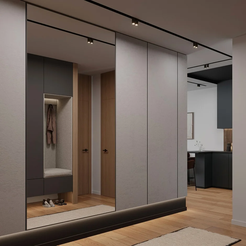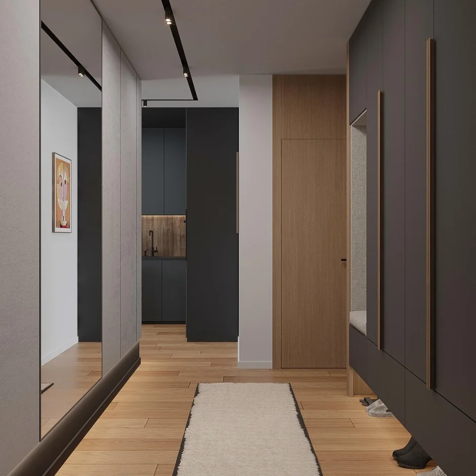 In this project, our team carried out a full-scale apartment renovation with a focus on modern minimalism, clean geometry, and high-quality finishes. The interior combines warm natural wood textures with matte dark surfaces and soft neutral tones, creating a functional, cohesive, and visually balanced living space.