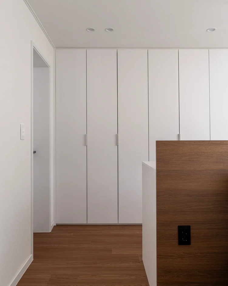 The bedroom features custom-built wardrobes with minimalist facades, forming a seamless plane with the surrounding walls. A bed with a wooden headboard was integrated into the overall interior composition. All furniture elements were manufactured and installed according to project specifications. -