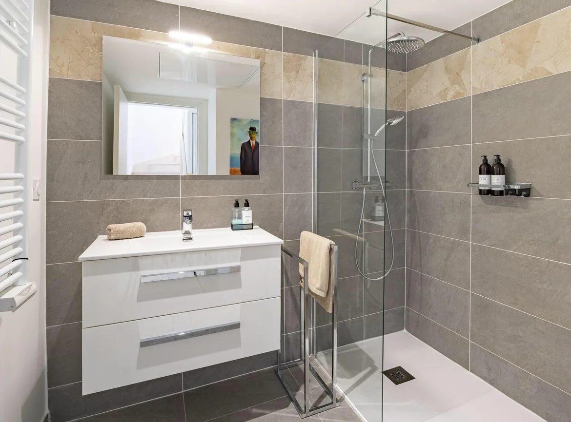 The bathroom was completed with a full waterproofing system, porcelain tile installation on walls and floors, and a walk-in shower with a glass enclosure and linear drain. Modern sanitary fixtures, a wall-mounted vanity, illuminated mirror, and accessories were installed. -
