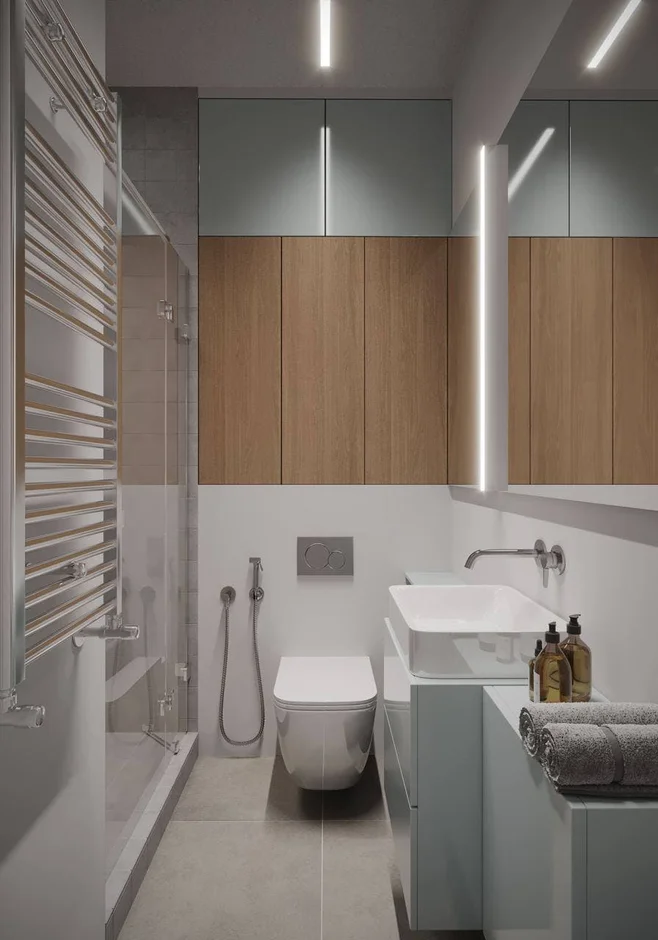 A wall-hung toilet with a concealed cistern was installed to enhance cleanliness and save space. All faucets and shower components feature a modern brushed-metal finish, combining durability with a refined, contemporary look.