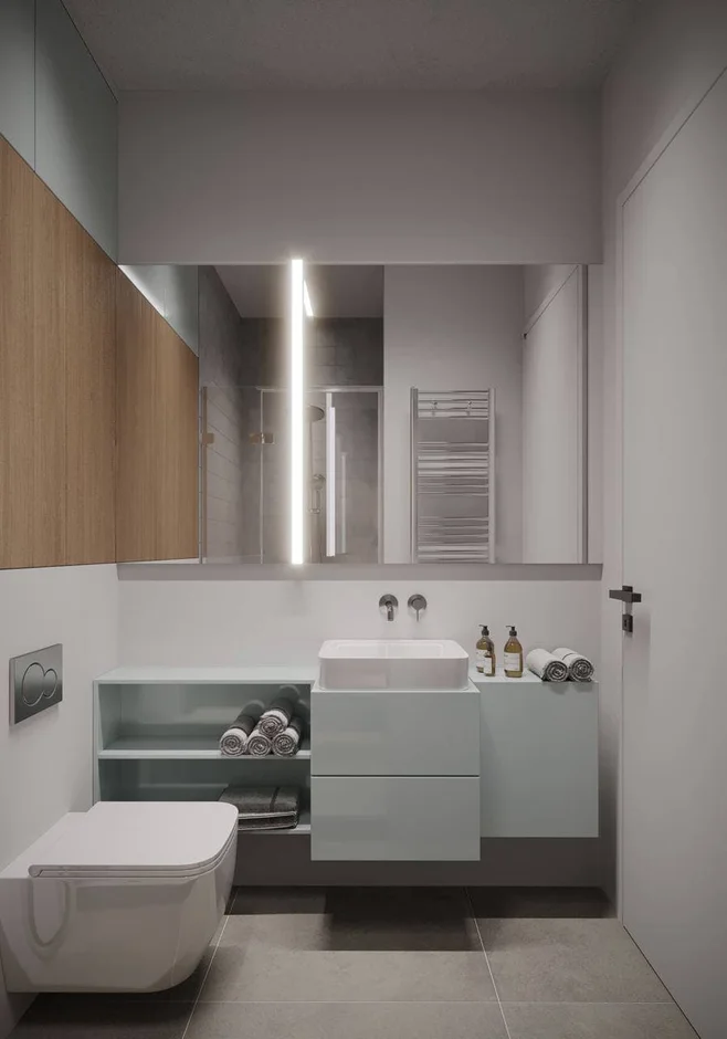 Bathroom walls were finished with large-format tiles for a clean, seamless appearance. Recessed wall niches with integrated lighting were added for practical storage and visual depth. All wet areas were properly waterproofed to meet modern building standards.