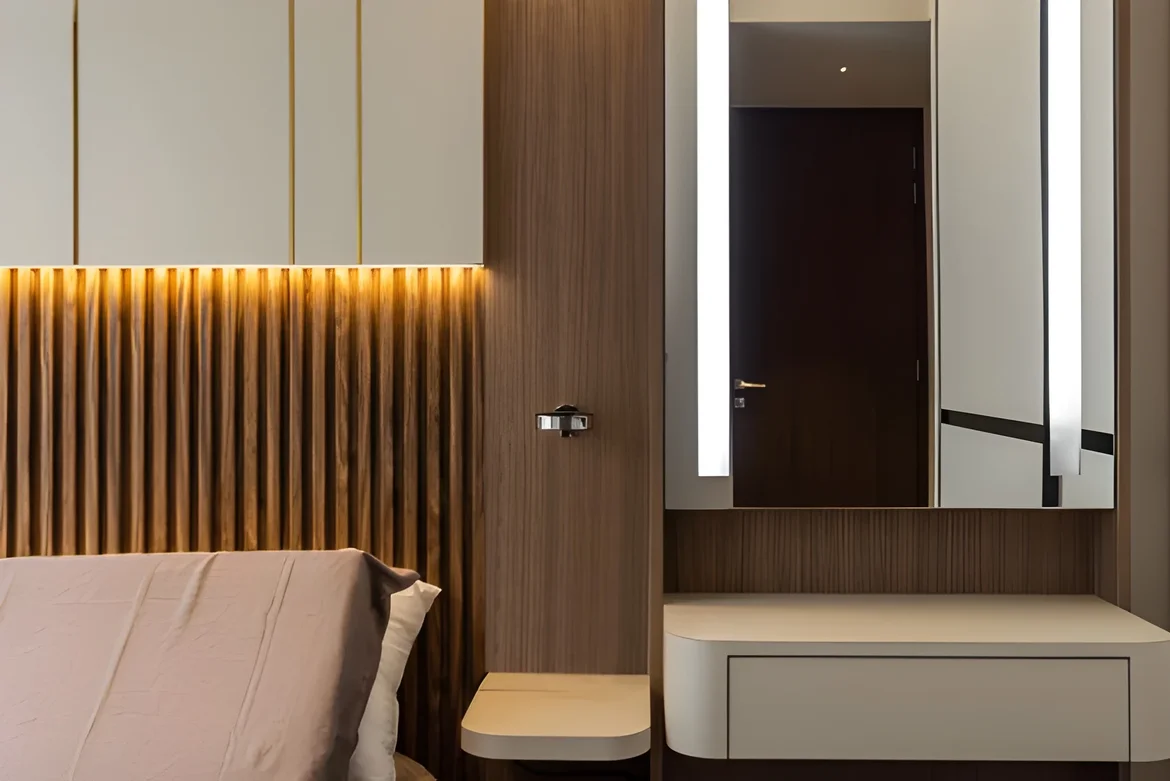 Redesigned the bedroom with custom headboard wall, integrated side tables, and soft backlighting