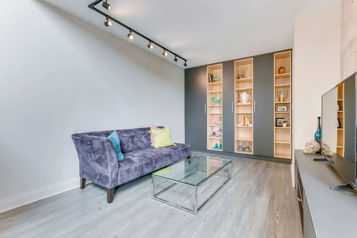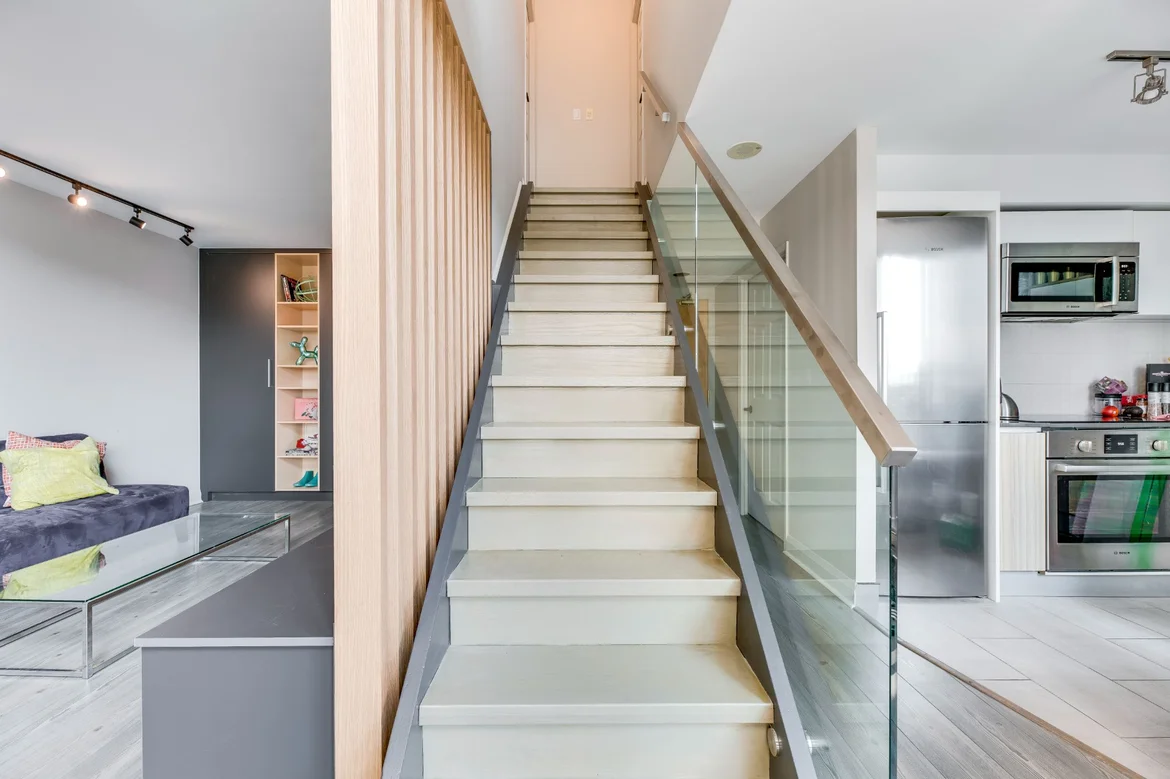 The renovated condo now feels open, bright, and distinctly modern. Custom millwork and architectural details give the space character, while the updated kitchen and bathroom add everyday comfort. The new staircase, wood slat divider, and layered lighting transform the apartment into a cohesive, loft-inspired home that balances design with functionality.