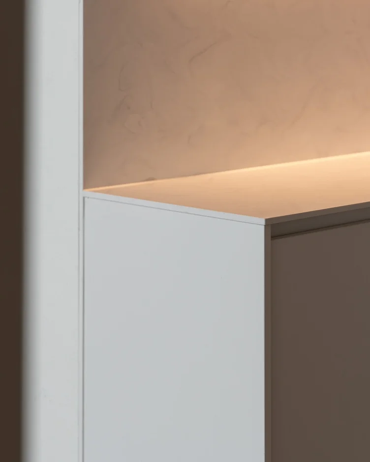 The bedroom was finished as a calm, private retreat. Built-in wardrobes with integrated lighting, layered wall finishes, and carefully planned lighting create a comfortable and visually balanced space. -