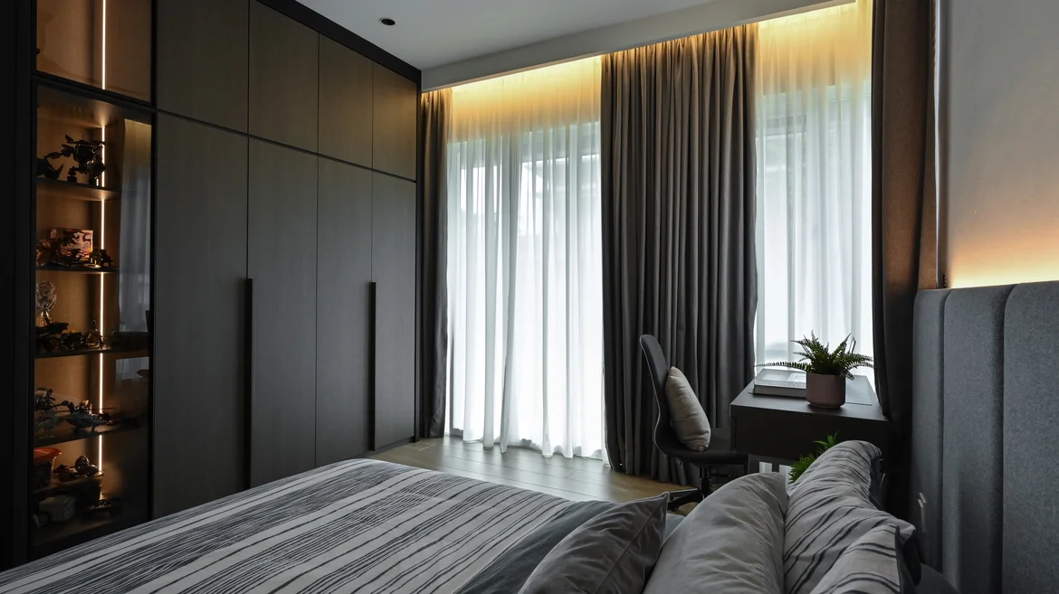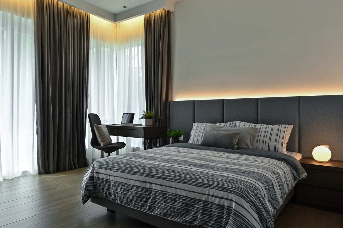 Electrical wiring was upgraded throughout the space, with new outlets and switches installed. Recessed ceiling lights and integrated LED strip lighting were added behind the bed headboard, along curtain lines, and around bathroom mirrors to create layered, adjustable illumination.