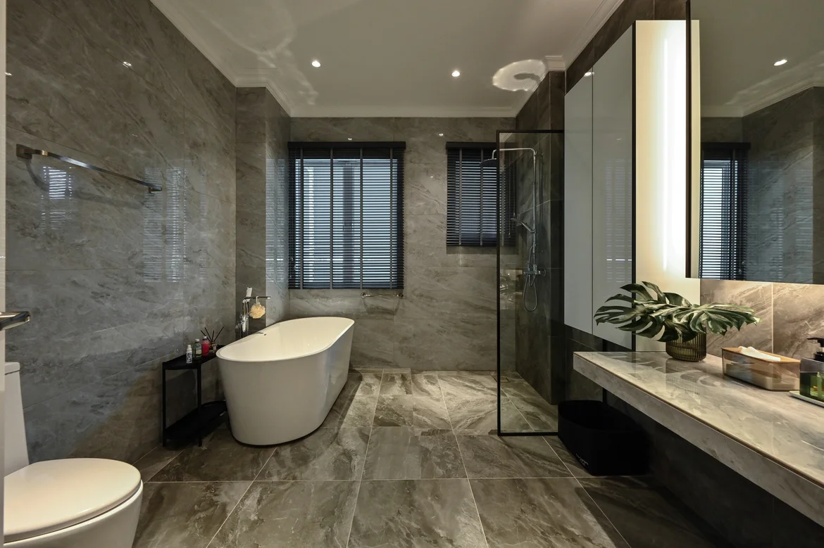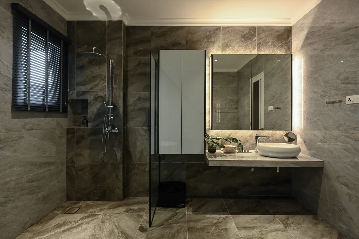 Large-format porcelain tiles with a stone-inspired finish were installed on bathroom walls and floors for a seamless, modern look. A frameless glass shower enclosure was added, creating an open, minimalist aesthetic while maintaining functionality.