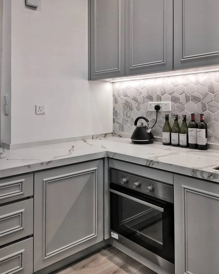 The kitchen received a full upgrade with new cabinetry, quartz countertops, and a decorative tile backsplash. Built-in appliances were integrated into the cabinetry for a clean, streamlined appearance. Wall and ceiling surfaces were fully prepared and finished, and updated lighting was installed to improve both functionality and ambiance.