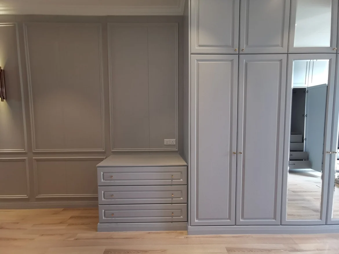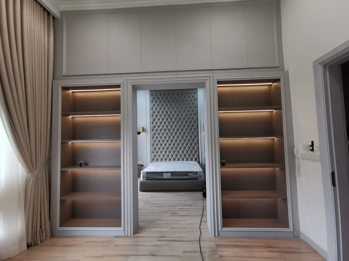 The hallway was redesigned with custom-built floor-to-ceiling cabinetry and integrated shelving, functioning as a seamless built-in wardrobe system. Decorative wall paneling was added to maintain design continuity with the rest of the interior. All surfaces were finished and painted, and new lighting fixtures were installed to improve brightness and spatial flow.