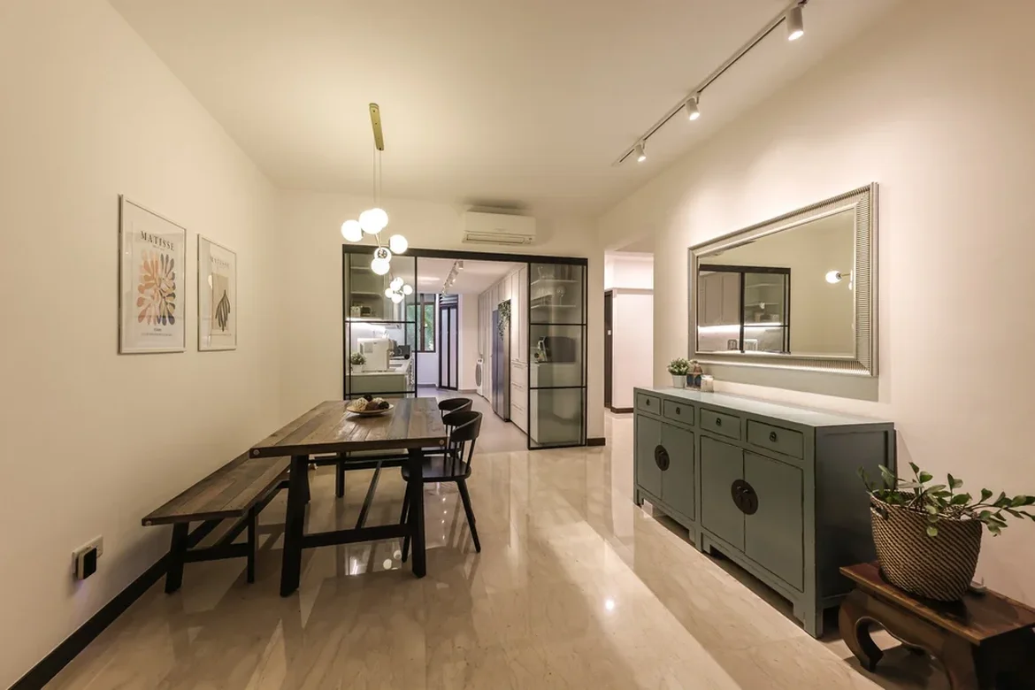 The remodeled apartment now feels balanced, modern, and inviting. Natural wood elements soften the contemporary design, while custom millwork maximizes storage without clutter. The finished space delivers a polished, comfortable home designed for everyday living.