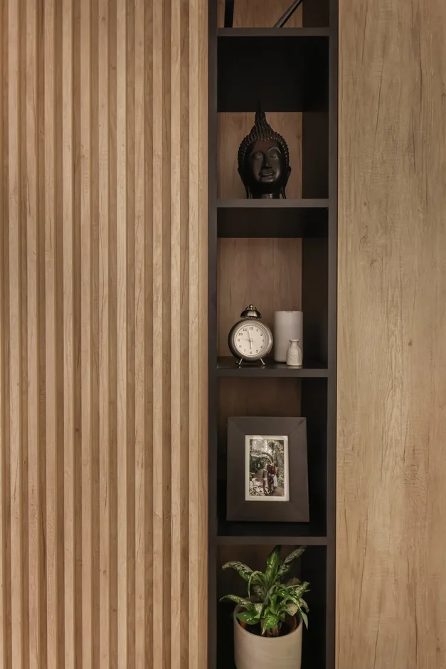 Redesigned the living room with a custom wood slat feature wall, integrated shelving, and media storage