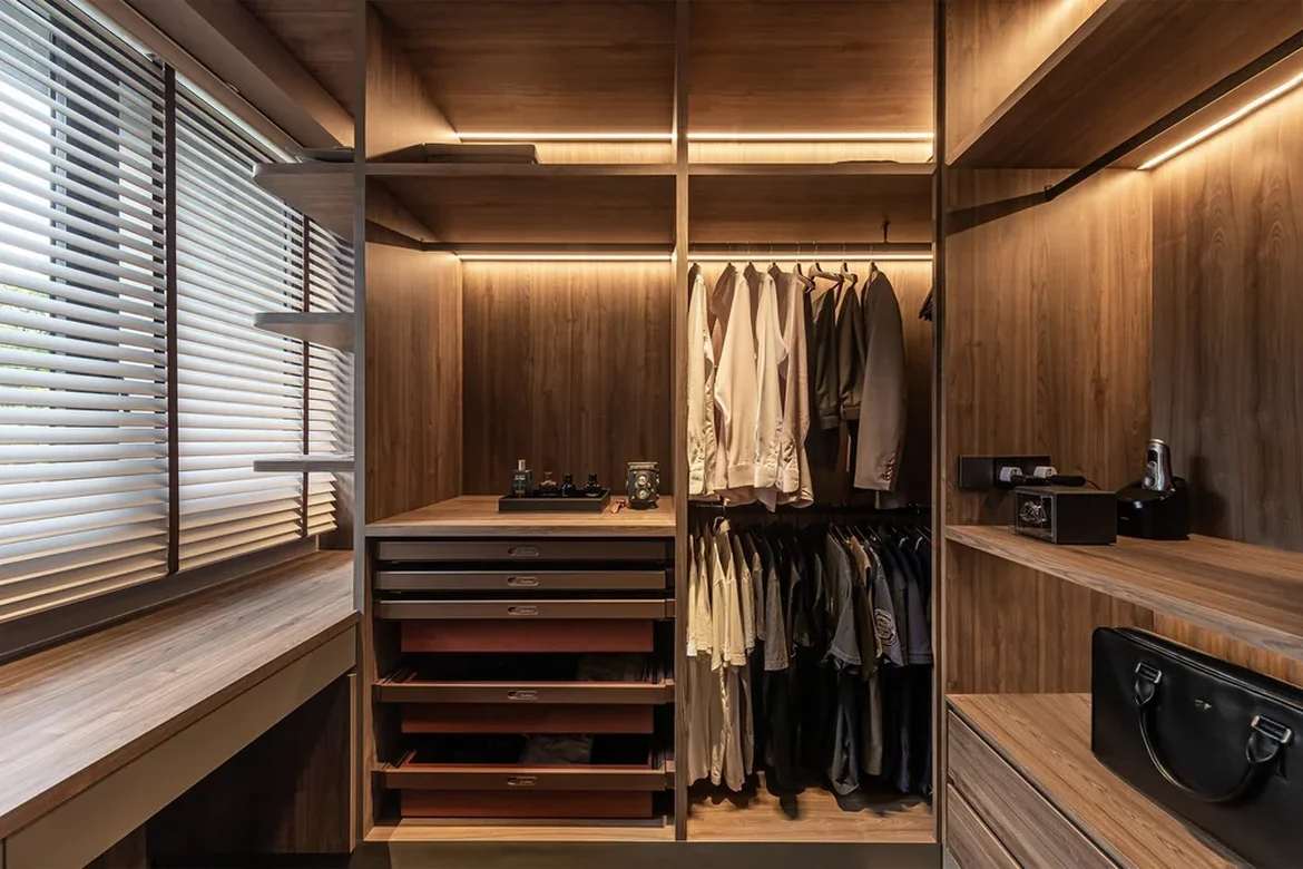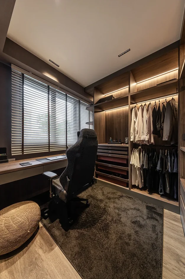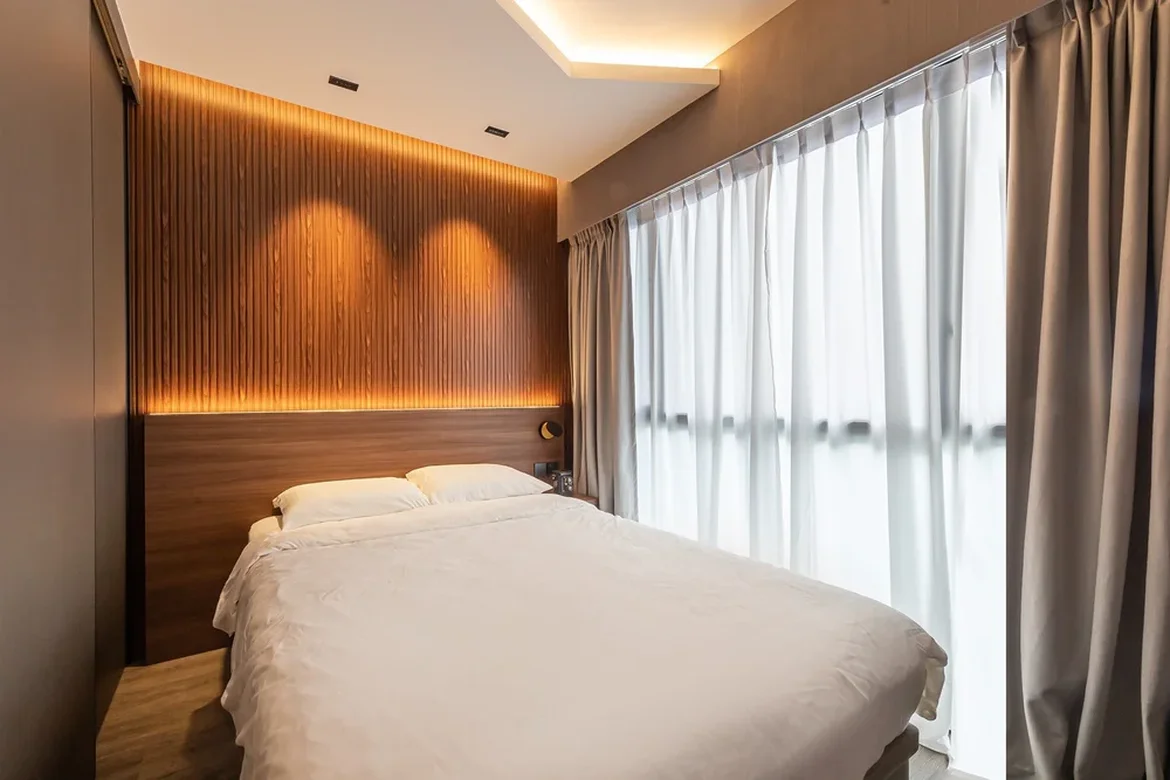 Added warmth in the bedroom with a wood feature wall and soft ambient lighting for a hotel-like mood.