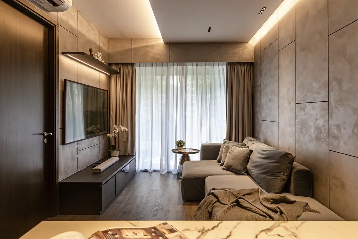 Created a cohesive “masculine” palette using charcoal, warm wood, and concrete/stone-look wall panels.