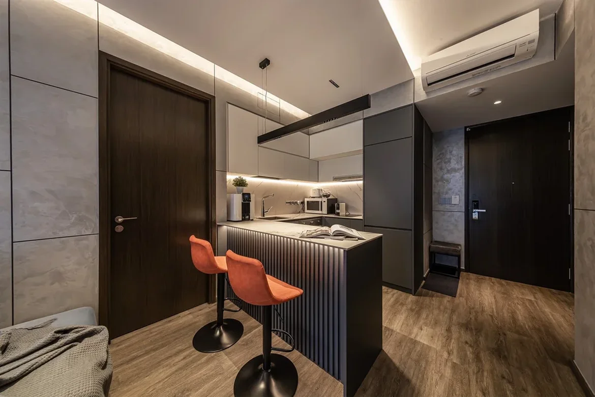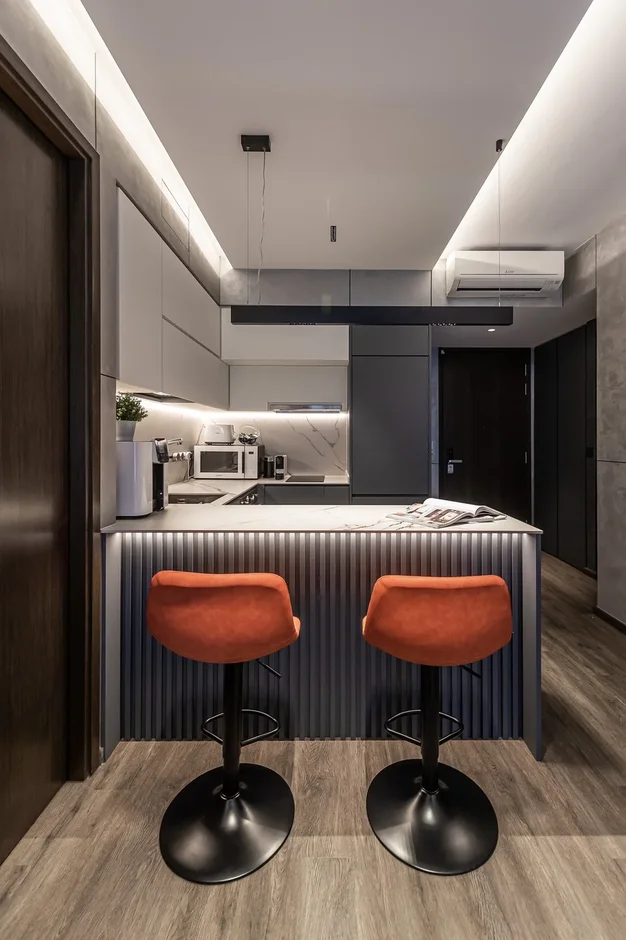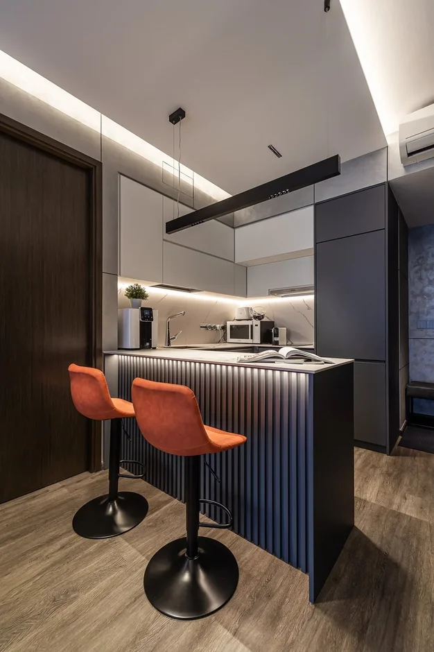 The apartment now feels bold, modern, and intentional. Darker finishes and layered lighting give it a premium, “boutique suite” vibe, while the custom storage and clean surfaces keep the space practical for everyday living. The kitchen and peninsula became the centerpiece—functional, sculptural, and perfect for quick meals or hosting.