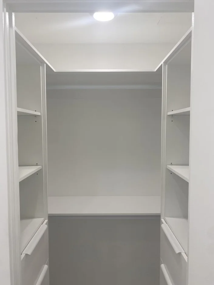 Storage upgrades: Built custom closet shelving with open cubbies and drawers for organized everyday living.