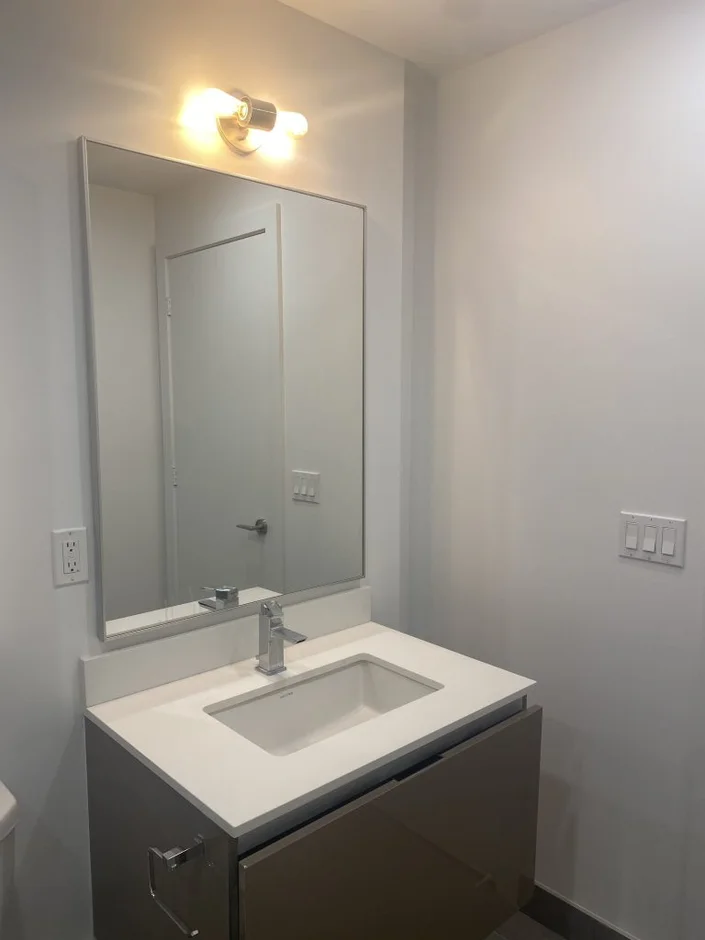 New floating-style vanity with integrated sink, oversized mirror, and updated lighting.