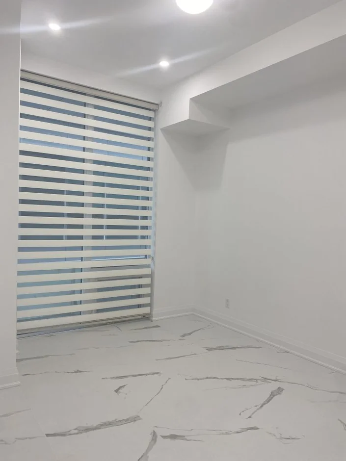 Window treatments: Installed modern zebra blinds for flexible privacy and soft daylight control.