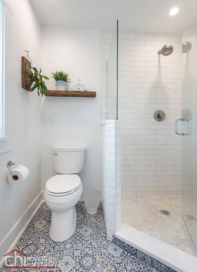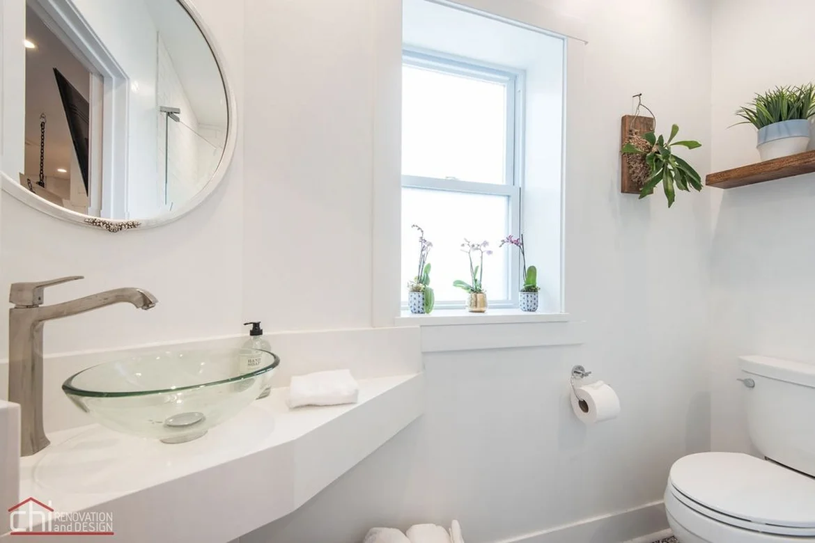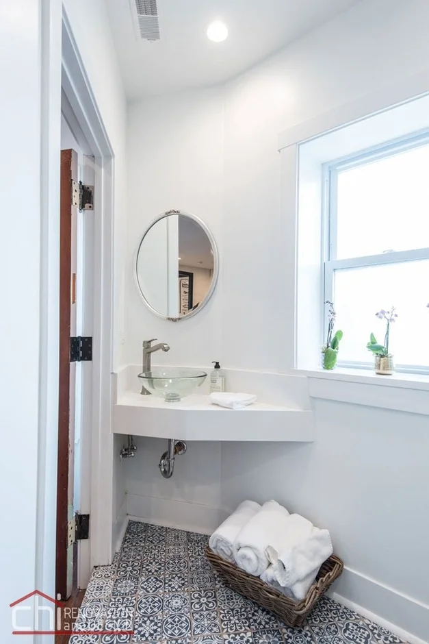 The bathroom was fully refreshed with a new vanity, modern vessel sink, and updated faucet. A new patterned tile floor was installed to add visual interest and durability, while the clean white wall finishes help maximize brightness in the compact space.