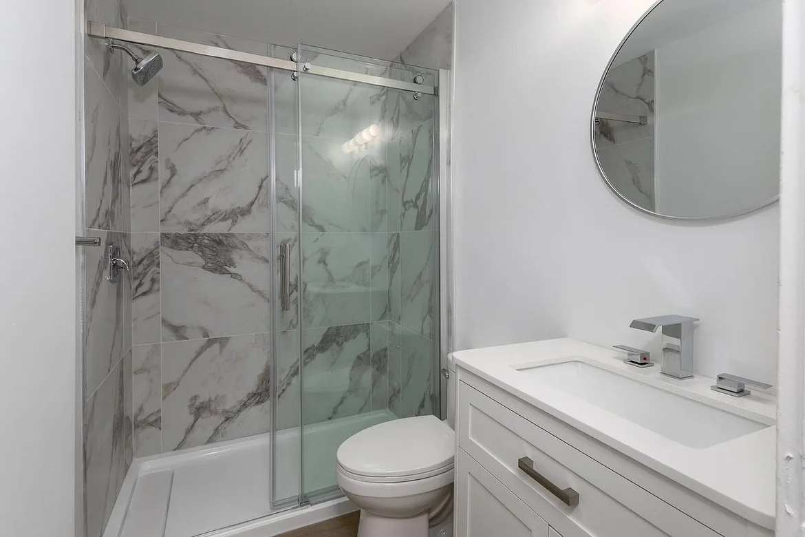 Completed a full bathroom renovation using large-format marble-look tiles, a glass shower enclosure, and modern sanitary fixtures. The space was designed to feel clean, functional, and visually refined. -