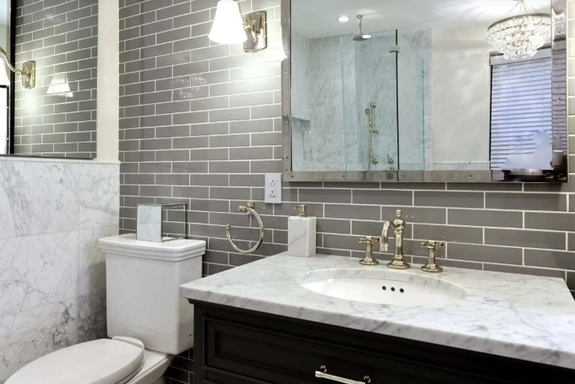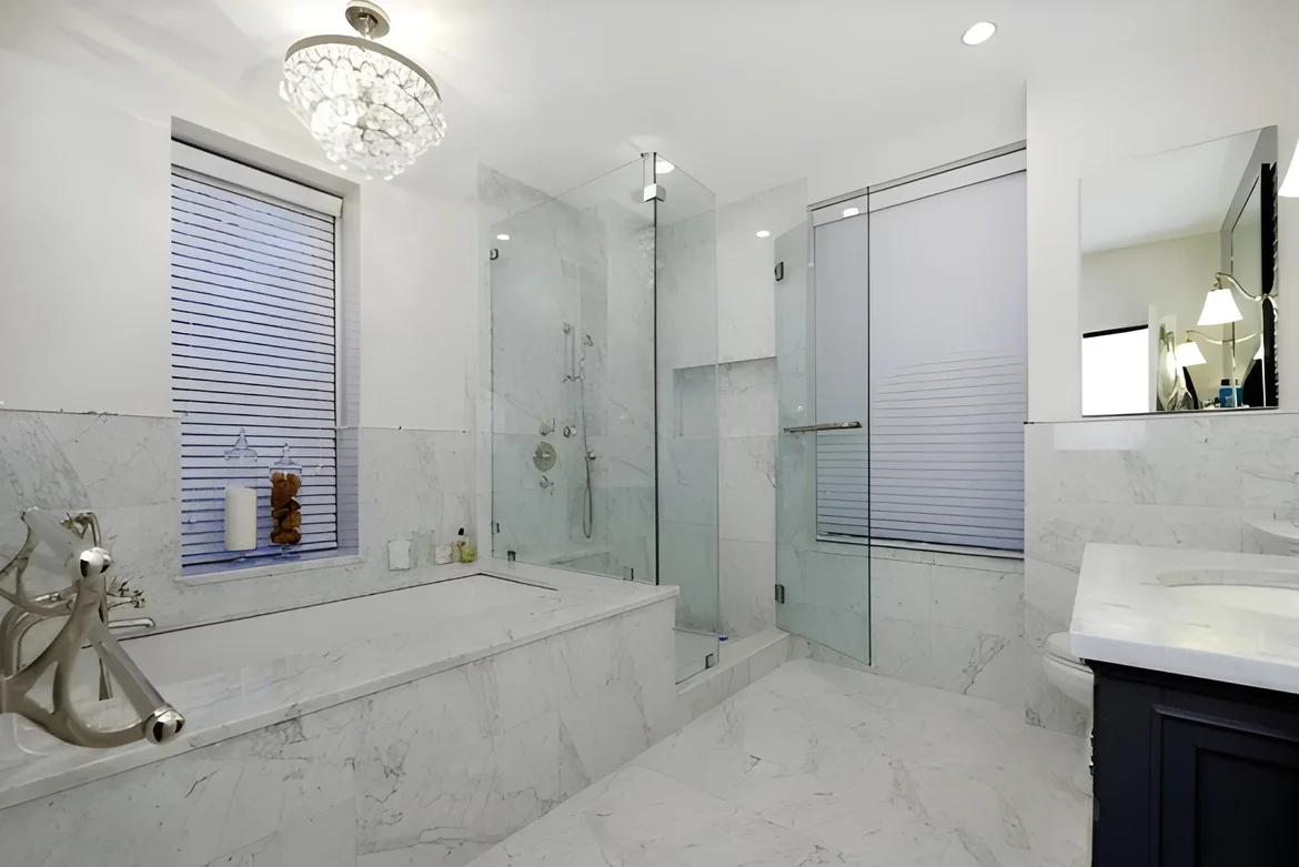 Created spa-like retreats with marble slab surrounds, custom soaking tubs, frameless glass showers, dark gray subway tiles, polished nickel fixtures, elegant vanities (including dark wood and floating designs), and sophisticated lighting. -