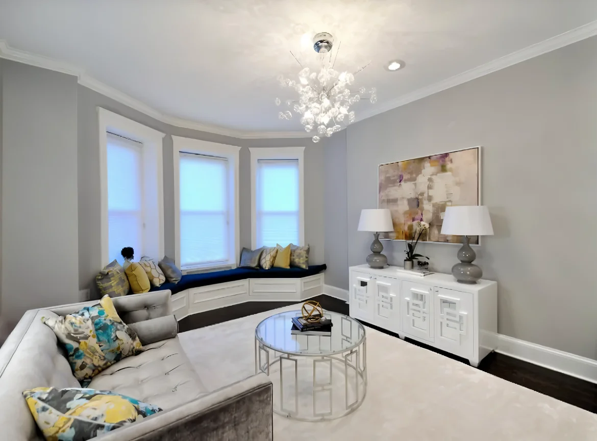 Added custom window seats with built-in storage, crown molding, dark hardwood flooring, fresh neutral paint in soft gray tones, and stylish built-in shelving. -