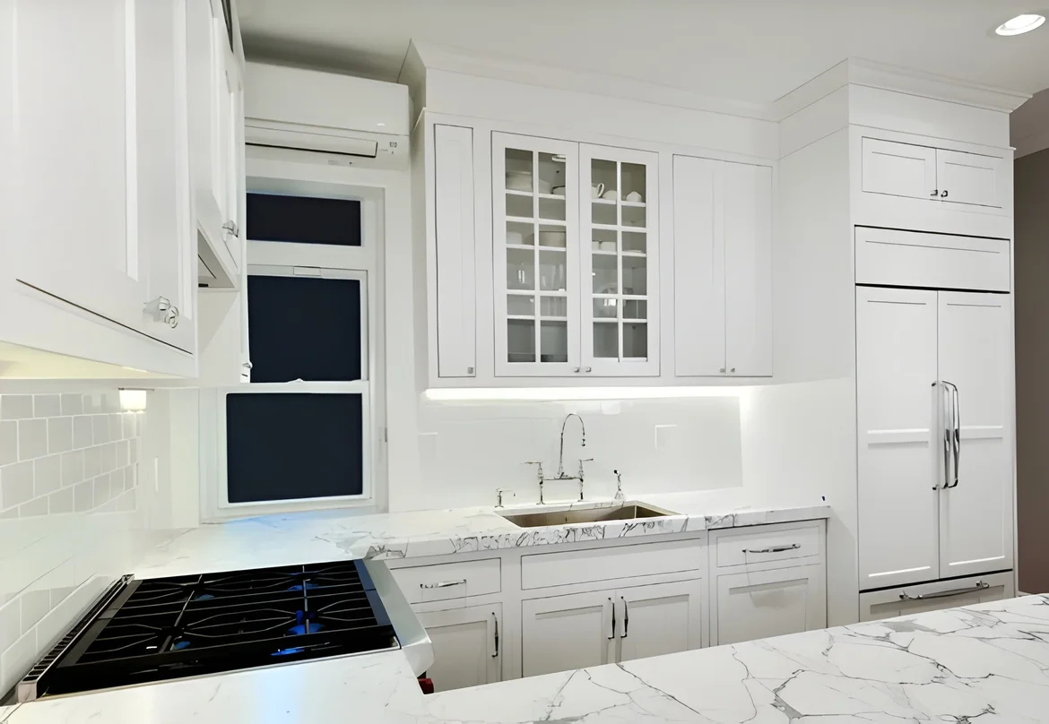 Installed crisp white shaker-style cabinetry with glass-front uppers, marble countertops, subway tile backsplash, under-cabinet lighting, and premium appliances including a built-in refrigerator and professional gas range. -