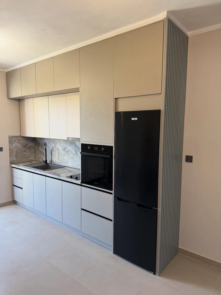 Installed full-height kitchen cabinets with smooth, handle-less fronts in neutral tones, creating a seamless and minimalist visual effect while maximizing storage. -