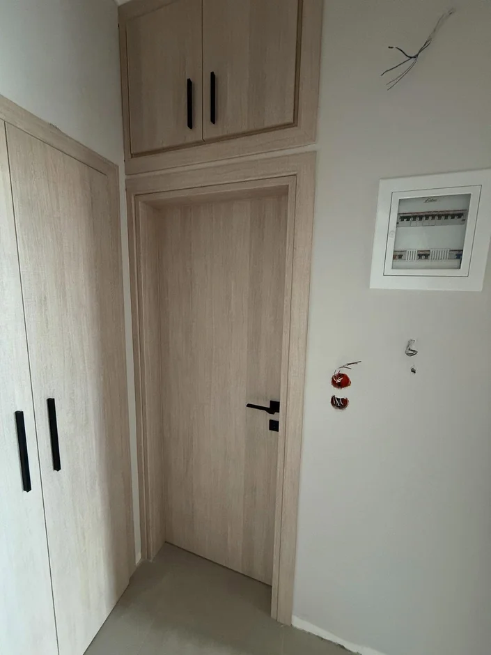 Installed floor-to-ceiling built-in cabinets in the corridor, offering discreet storage while maintaining visual continuity with the kitchen design. -