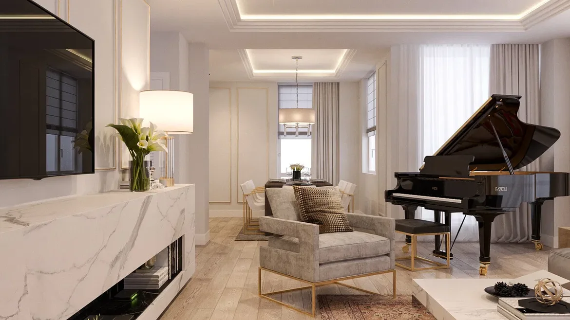 The apartment now feels polished, bright, and timeless. The living room reads as a luxurious yet inviting space, anchored by the marble fireplace and layered lighting. Soft neutrals, warm metallic accents, and custom millwork work together to create an interior that feels both elegant and livable— perfect for everyday comfort as well as entertaining.