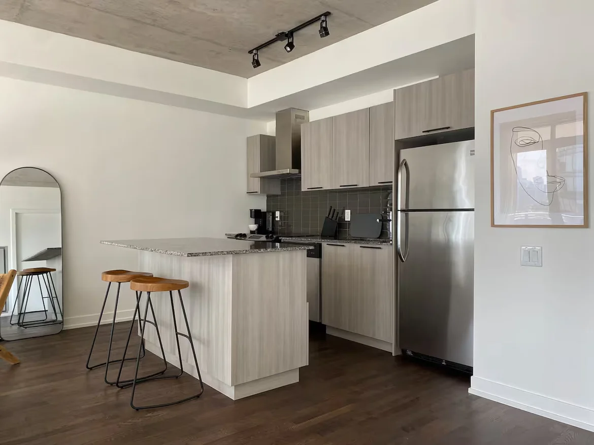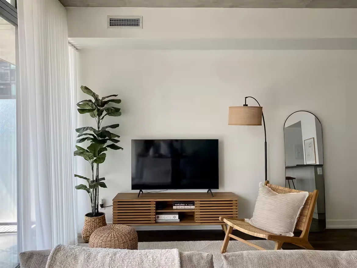 The apartment now feels bright, calm, and intentionally designed. The living room is cozy and inviting with warm wood tones, soft neutral fabrics, and clean-lined decor, while the kitchen reads modern and polished with upgraded lighting and a more organized, functional setup. In the bathroom, the refreshed vanity and crisp finishes create a boutique-hotel feel—simple, clean, and elevated.