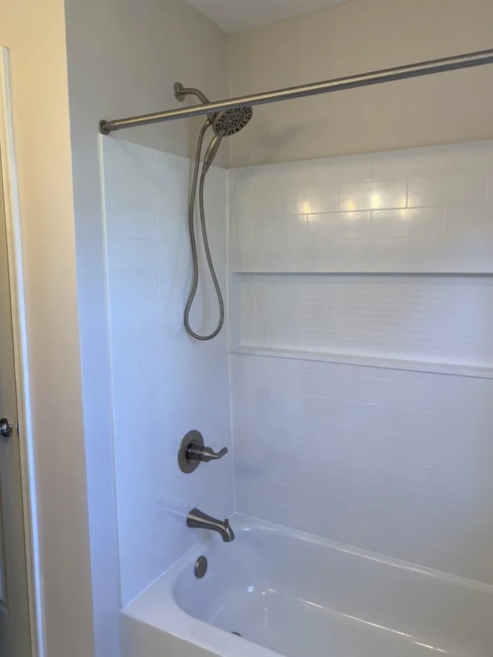 A new bathtub was installed, and the surrounding walls were finished with clean white tile. The refreshed tub area delivers a modern, low-maintenance surface while maintaining a bright and cohesive look.