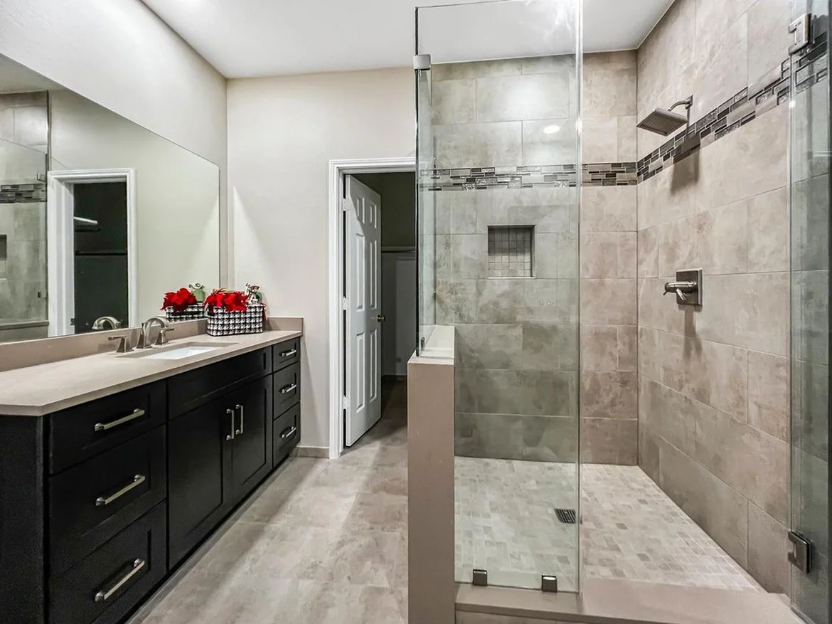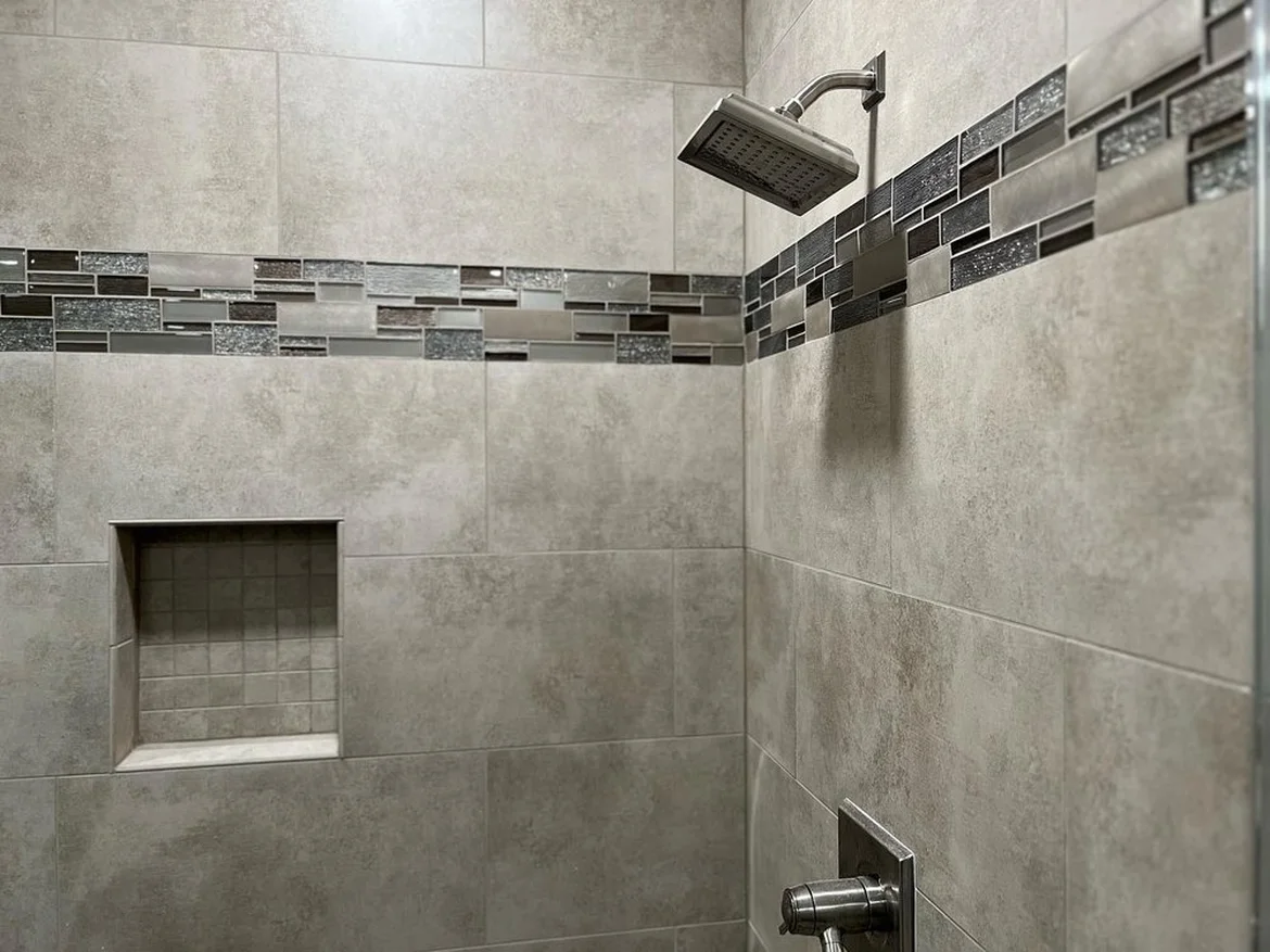 The previous shower was fully demolished and rebuilt with new waterproofing, a modern shower pan, and large-format porcelain wall tile. A decorative mosaic accent band was installed around the shower for added style, along with a custom built-in niche for storage. The shower now features a sleek square rainfall showerhead and updated stainless steel trim.