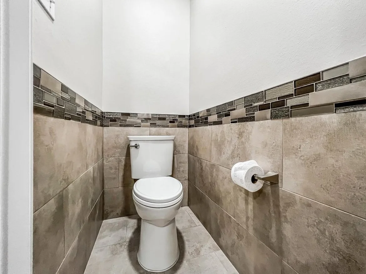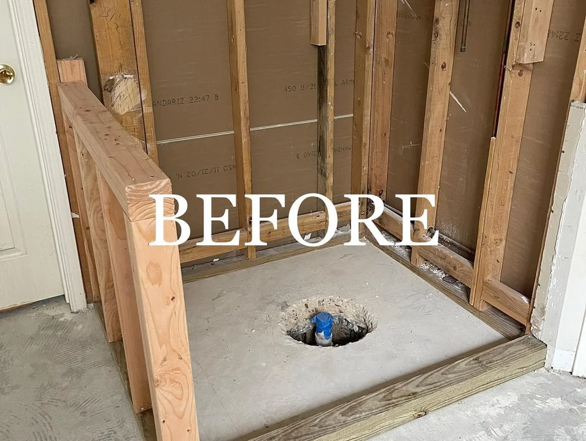 All old flooring was removed and replaced with durable, water-resistant porcelain tile. The new flooring provides long-term performance while matching the wall tile for a unified, high-end look.