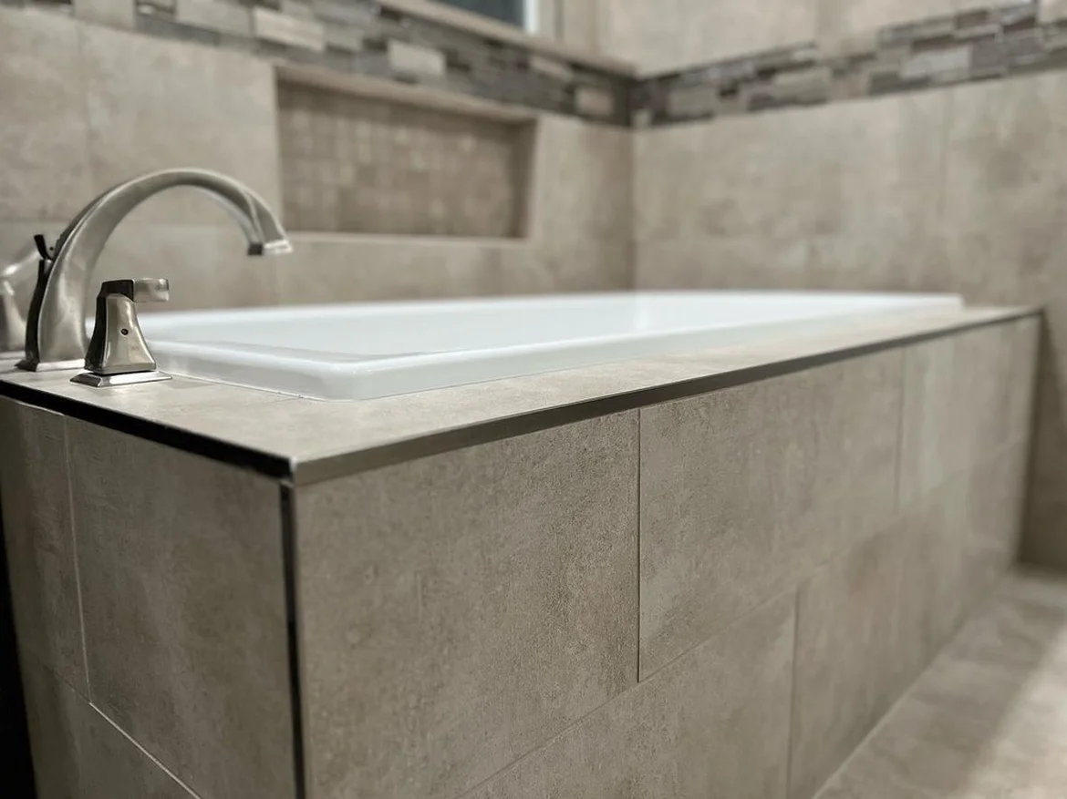 The outdated tub area was completely removed and replaced with a custom-built tiled tub surround. The new deck and vertical surfaces were finished with matching porcelain tile and clean metal trim, creating a smooth transition between the tub and shower design. A modern brushed-nickel tub faucet set completes the upgrade.
