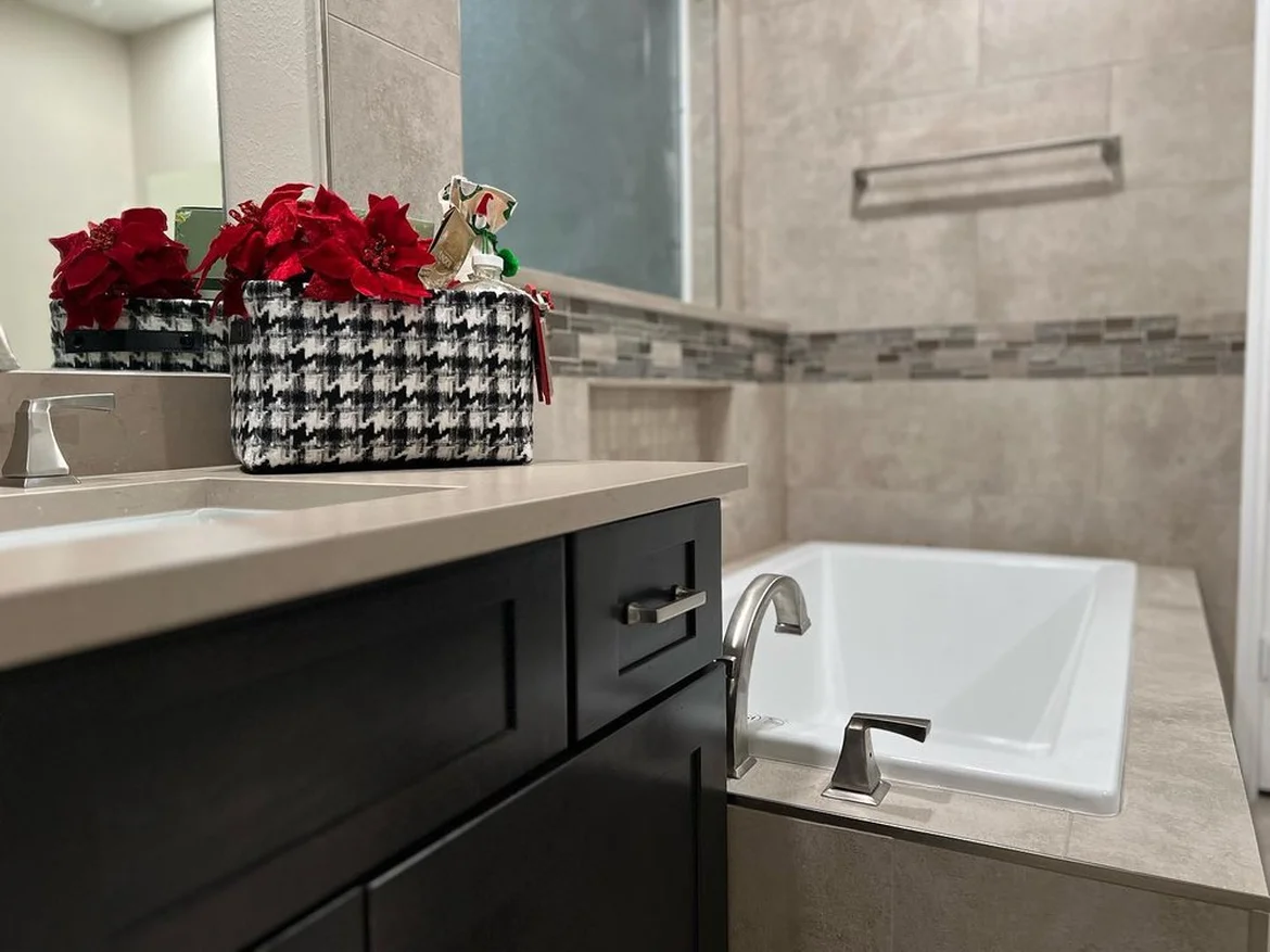 The vanity area was transformed with brand-new cabinetry featuring a modern dark finish, shaker-style fronts, and soft-close hardware. Updated solid-surface countertops were installed to enhance both durability and aesthetics.