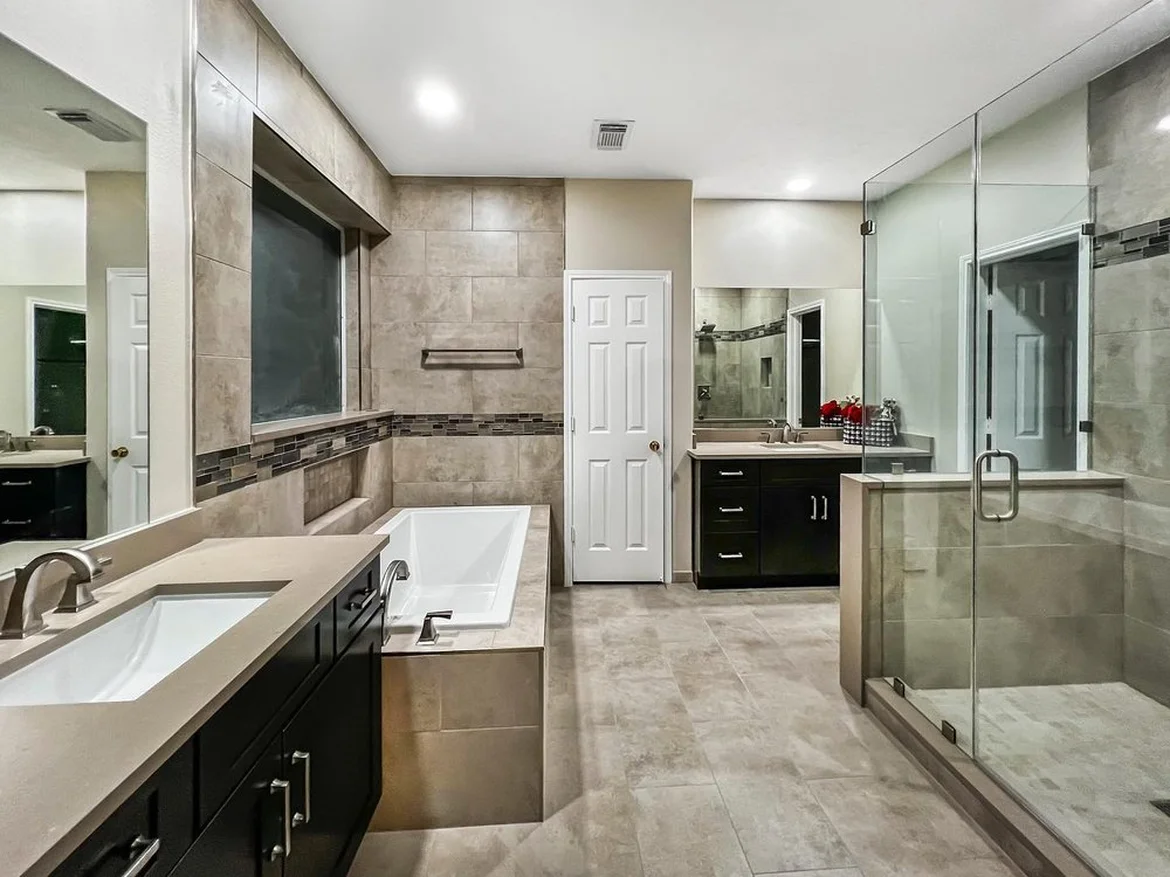 All necessary plumbing lines were updated to accommodate new fixtures in the shower, tub, and vanity. Electrical components, including outlets, switches, and lighting, were upgraded and optimized for improved brightness and safety throughout the bathroom.