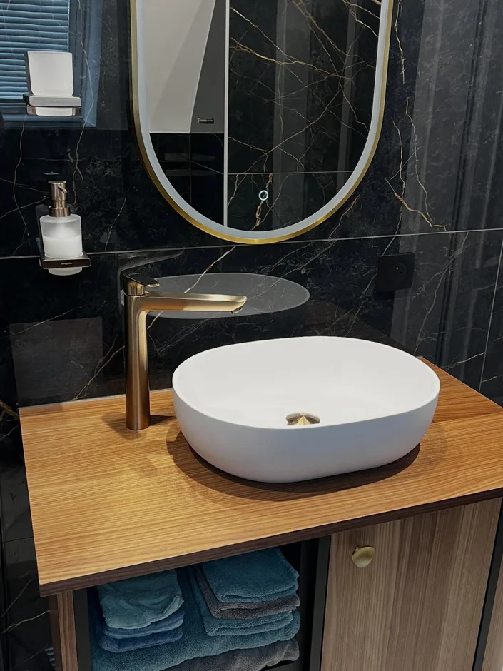 Positioned a matte white oval vessel basin on the timber countertop to introduce softness and visual contrast against the strong linear elements. -