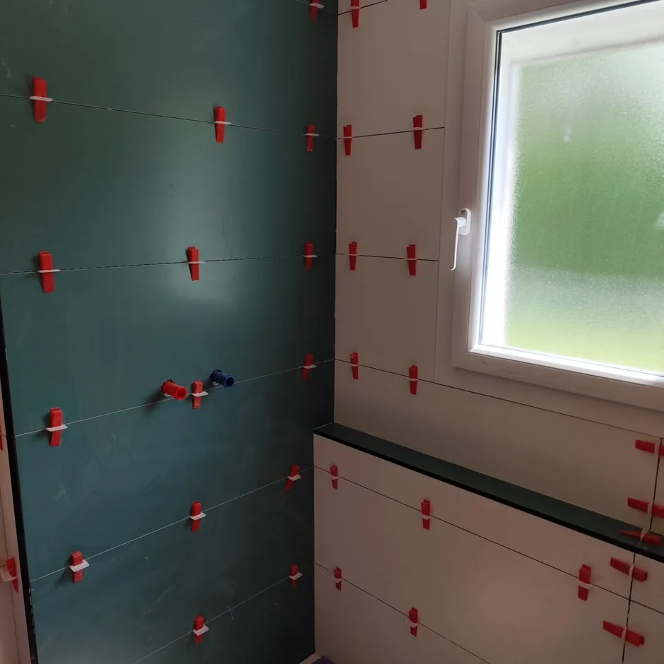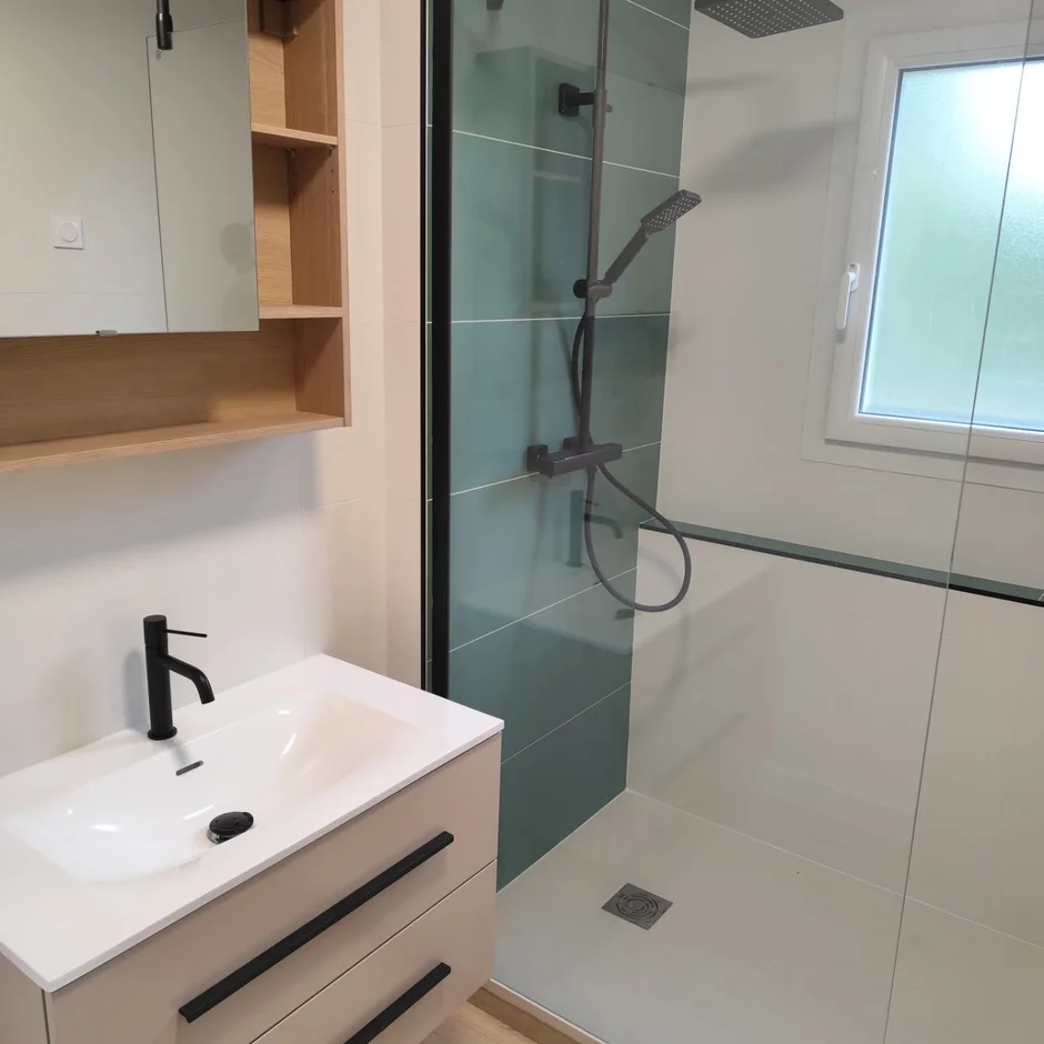 Designed a spacious walk-in shower with a seamless low-profile base and clear glass partition. The vertical green accent tiles introduce depth and character, becoming a subtle focal point while maintaining a minimalist feel. -
