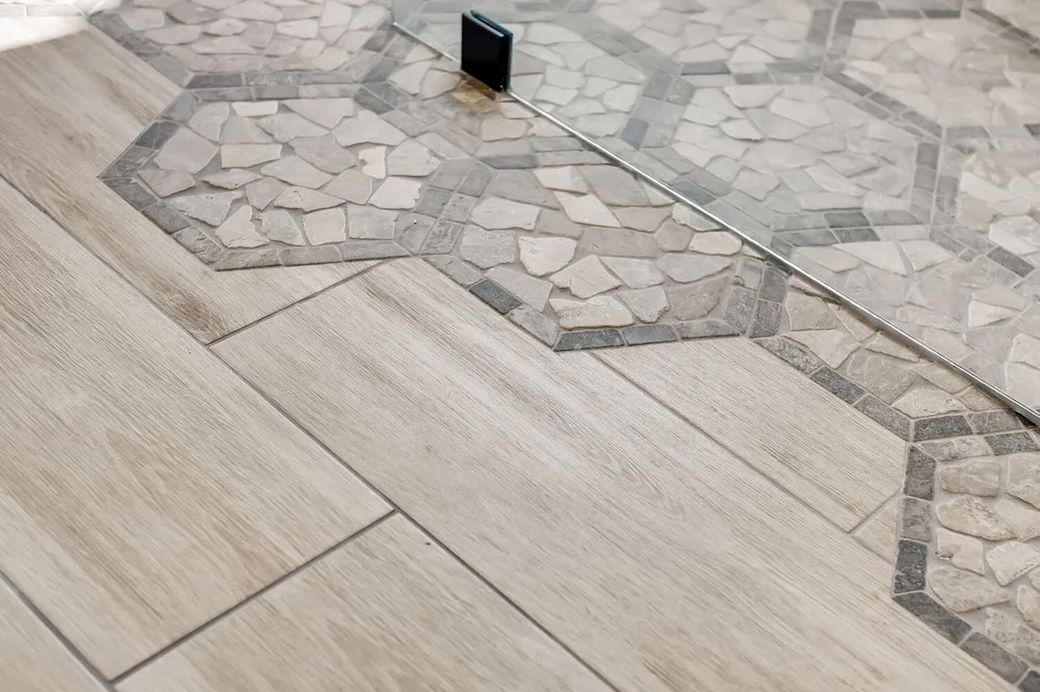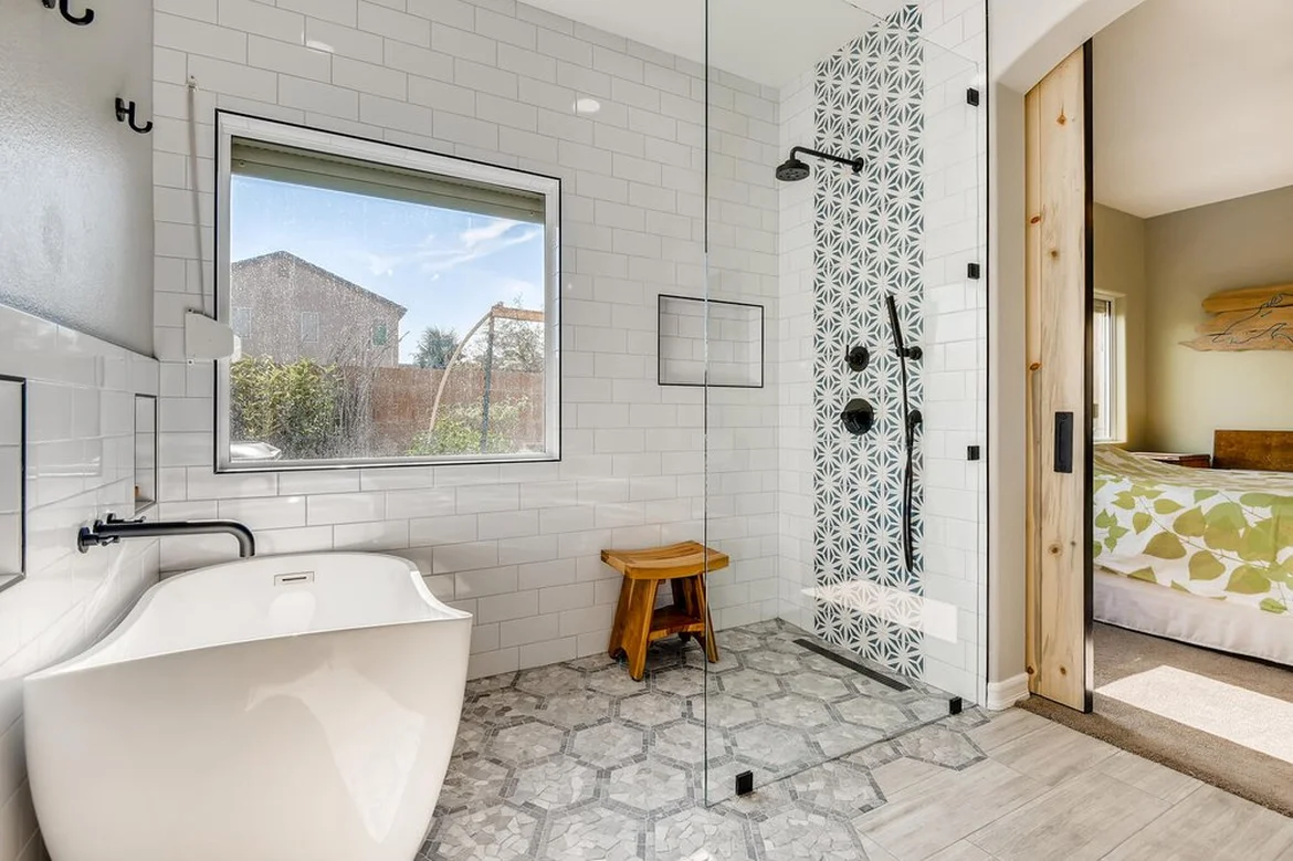 Two flooring materials were installed to properly zone the space. Decorative patterned tile was used in the wet areas, while wood-look flooring was installed throughout the main bathroom area to add warmth, contrast, and a natural aesthetic while maintaining moisture resistance.