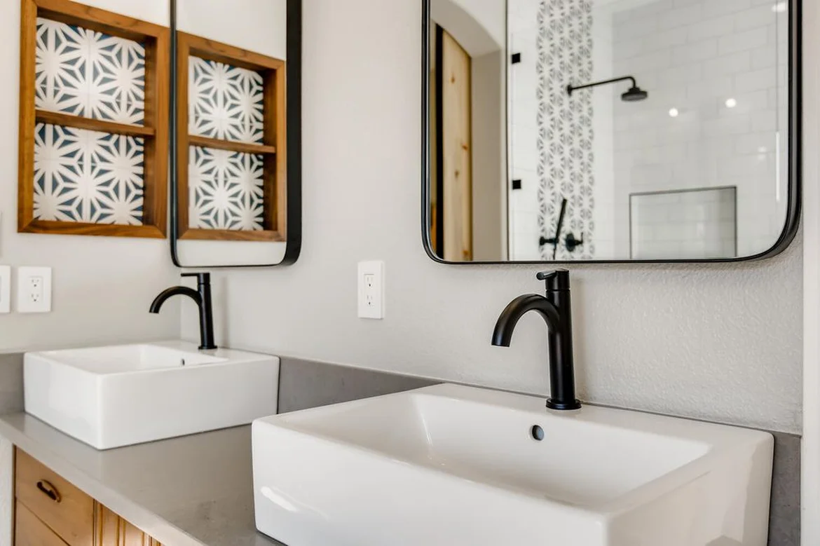 Two modern vessel sinks were installed along with matching matte-black faucets. New drain assemblies and plumbing connections were completed to ensure proper performance and longevity.